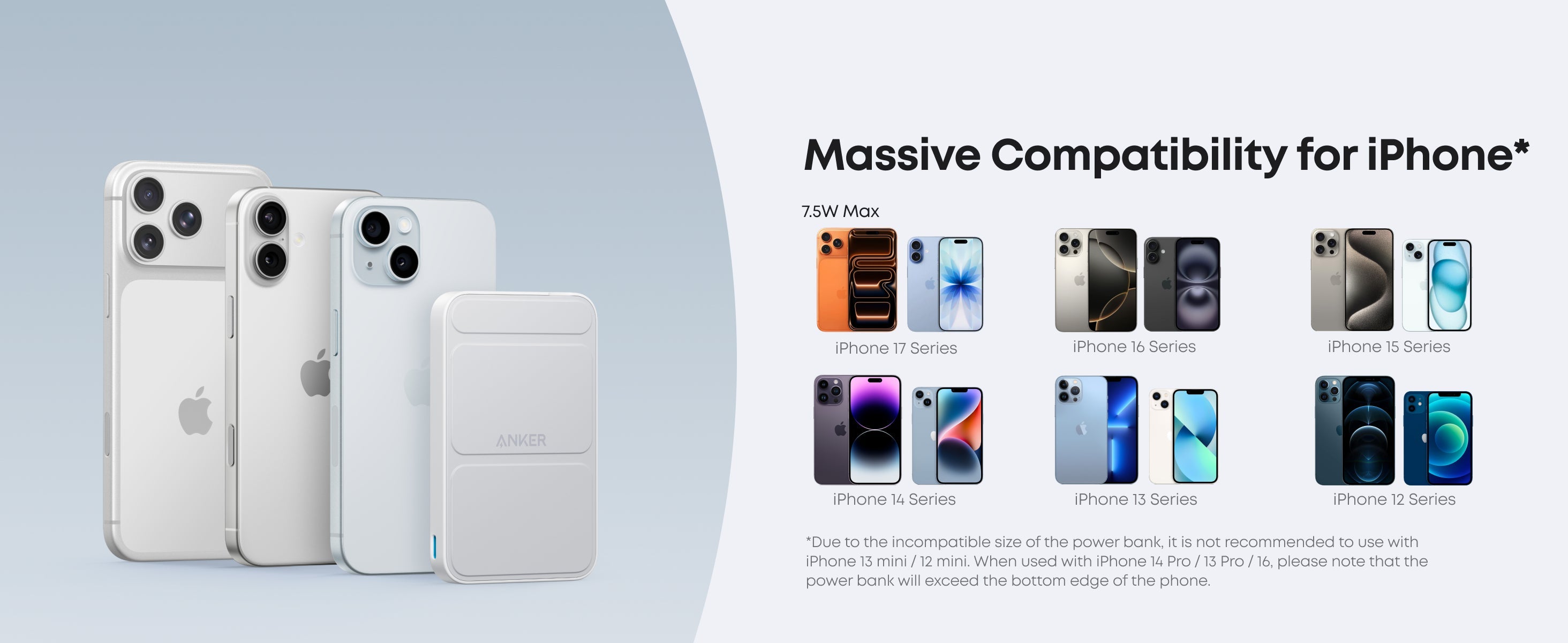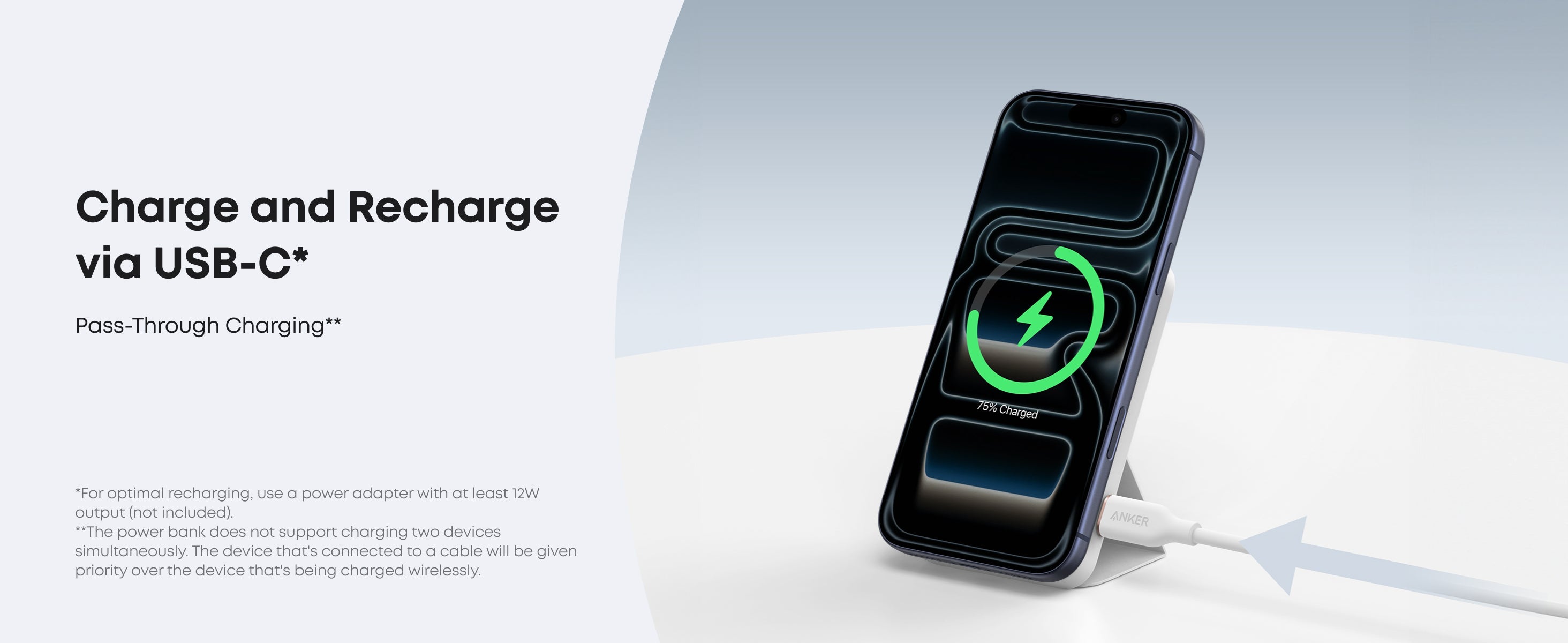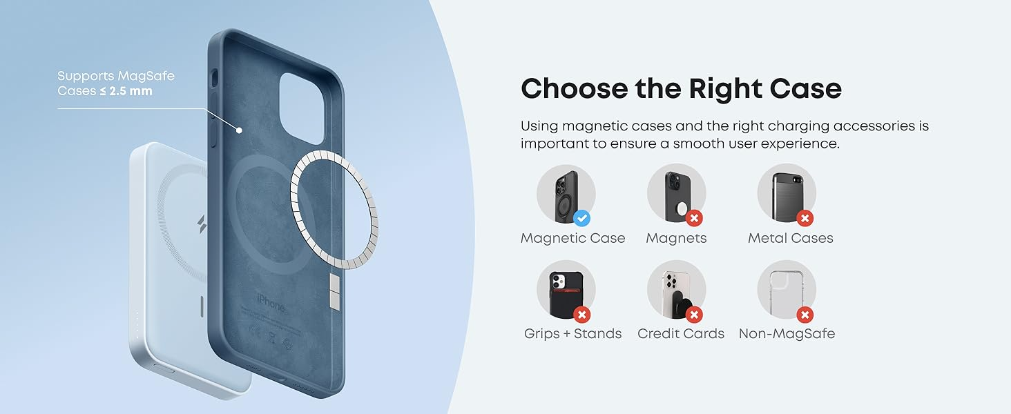 For efficient recharge, use a 12W charger. The power bank supports 7.5W max wireless charging for iPhone 12 and later models. It’s not compatible with Android phones. Cases thicker than 2.5 mm and non-magnetic cases may reduce charging efficiency.