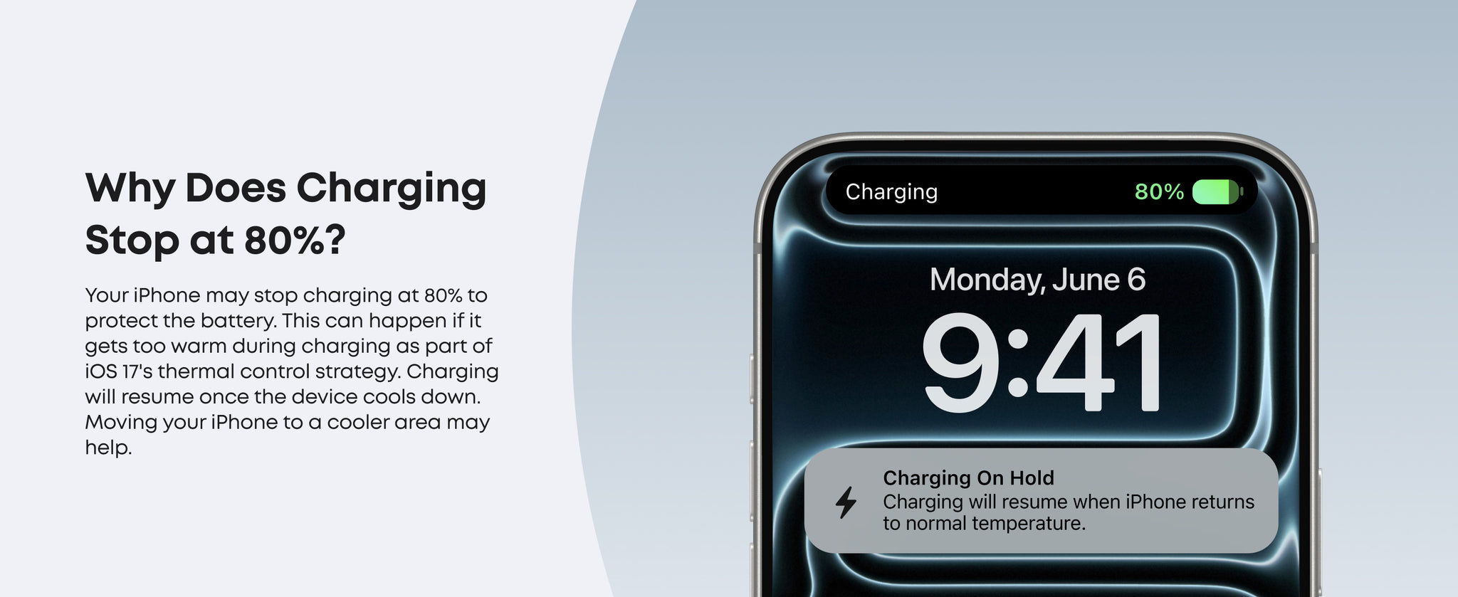 Your iPhone may automatically stop charging at 80% to protect its battery from overheating, as part of iOS 17's thermal management strategy. Charging will resume once the device cools down. Moving it to a cooler spot can help speed up this process.