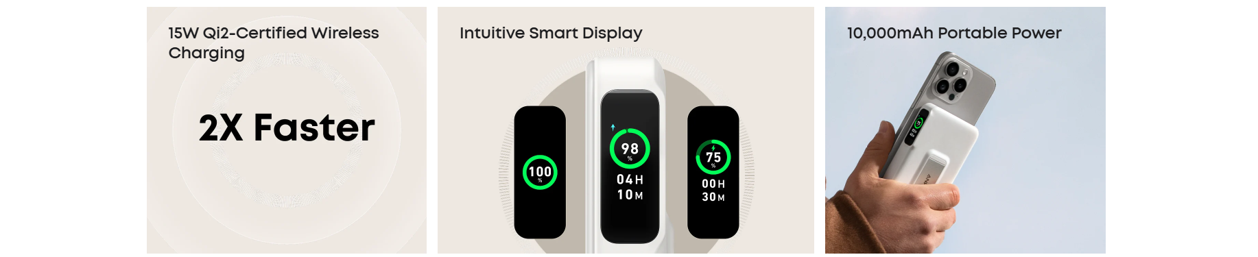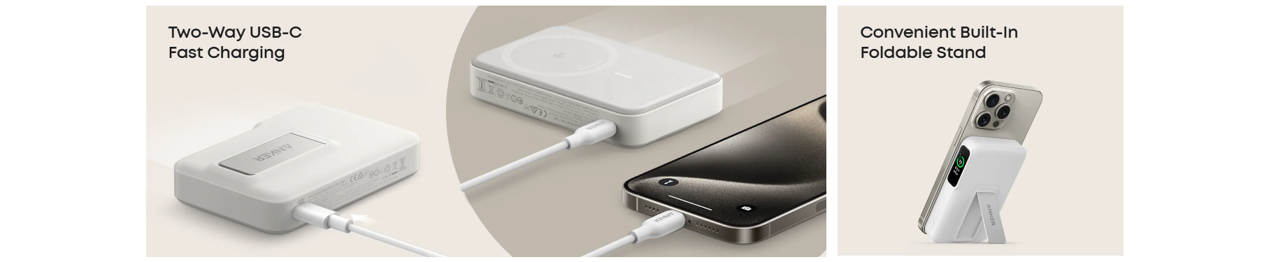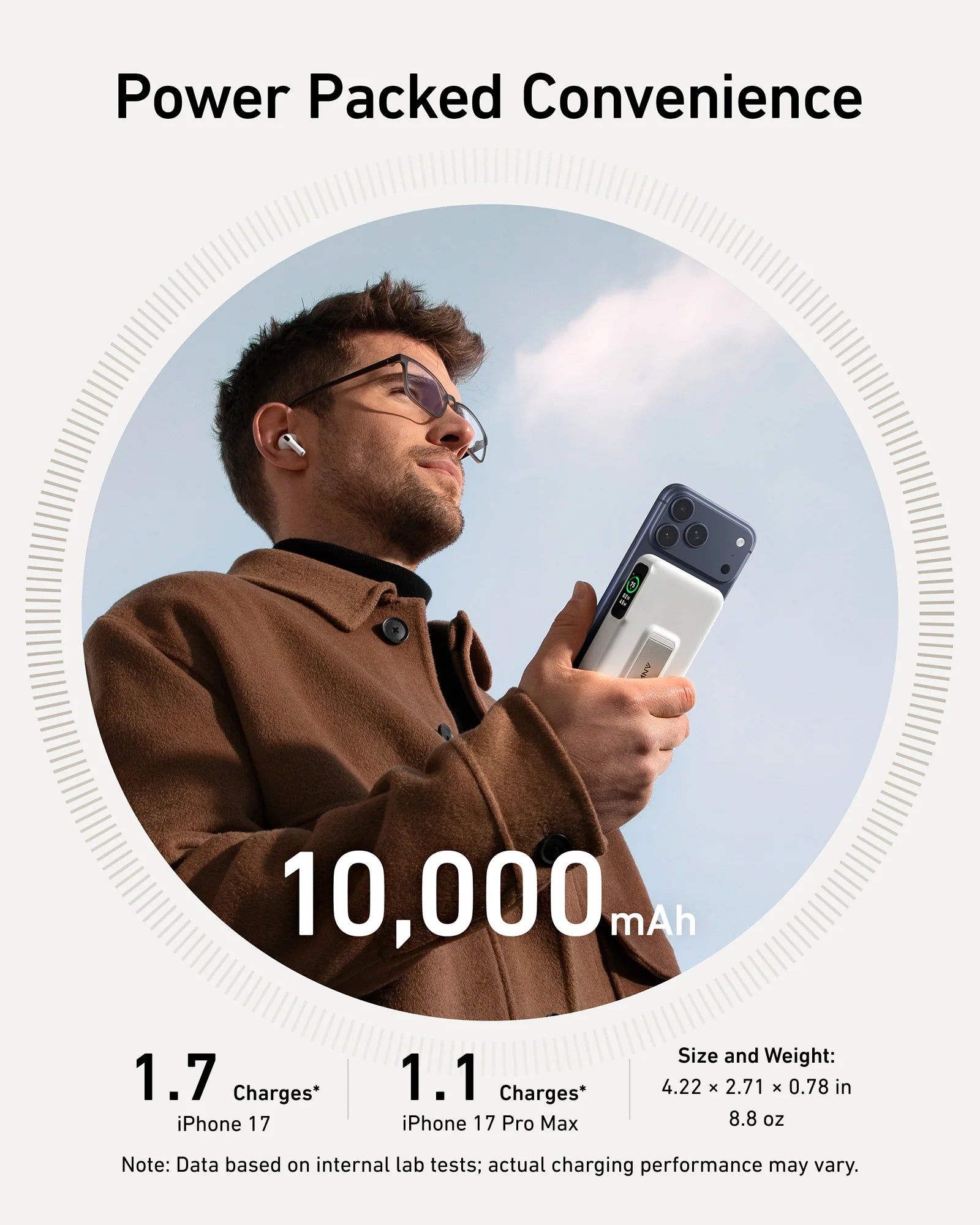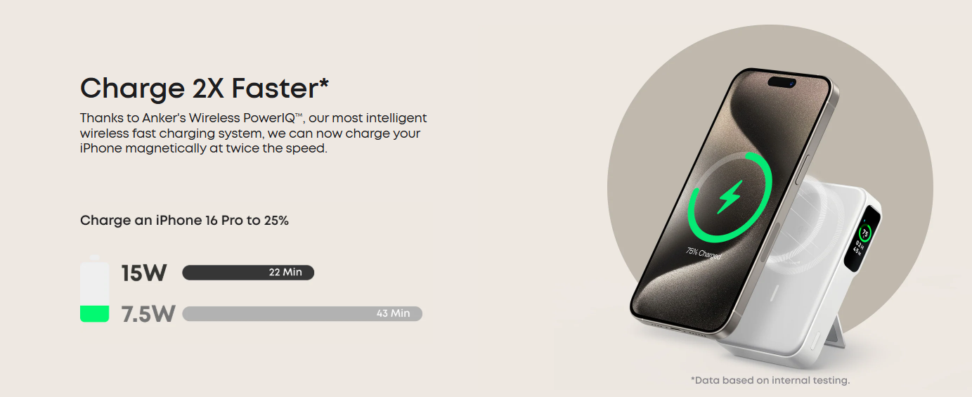 The capacity reduction during charging is due to a 30% to 45% energy loss in the battery cells and conversion circuitry. Therefore, a fully charged Anker MagGo Power Bank (10K) offers an estimated 6,000mAh to 7,000mAh to power devices.