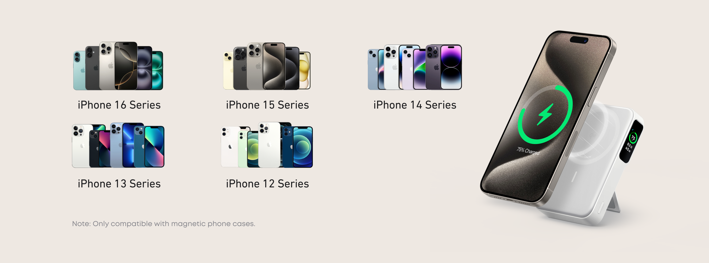 Ensure your iPhone 12 runs iOS 17.4 or later, and iPhone 13 or later has iOS 17.2 for optimal charging and display; this power bank is not Android-compatible. If the USB-C port is charging a device, wireless charging output will be reduced to 5W.